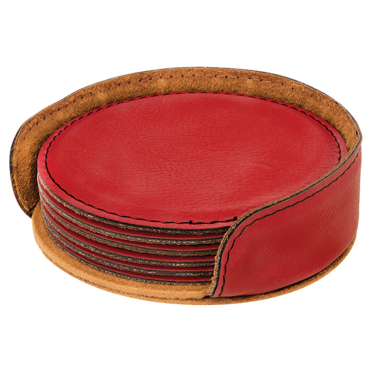 4" Red Laserable Leatherette Round 6-Coaster Set
